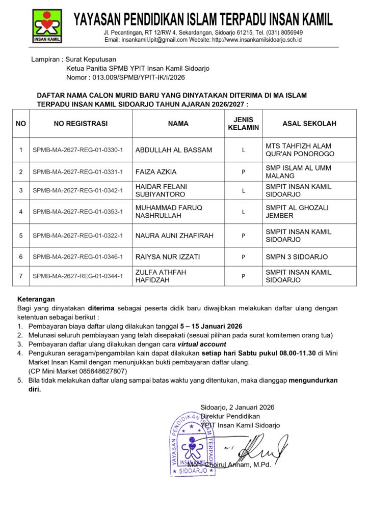 Pengumuman SPMB MAIT Insan Kamil Sidoarjo