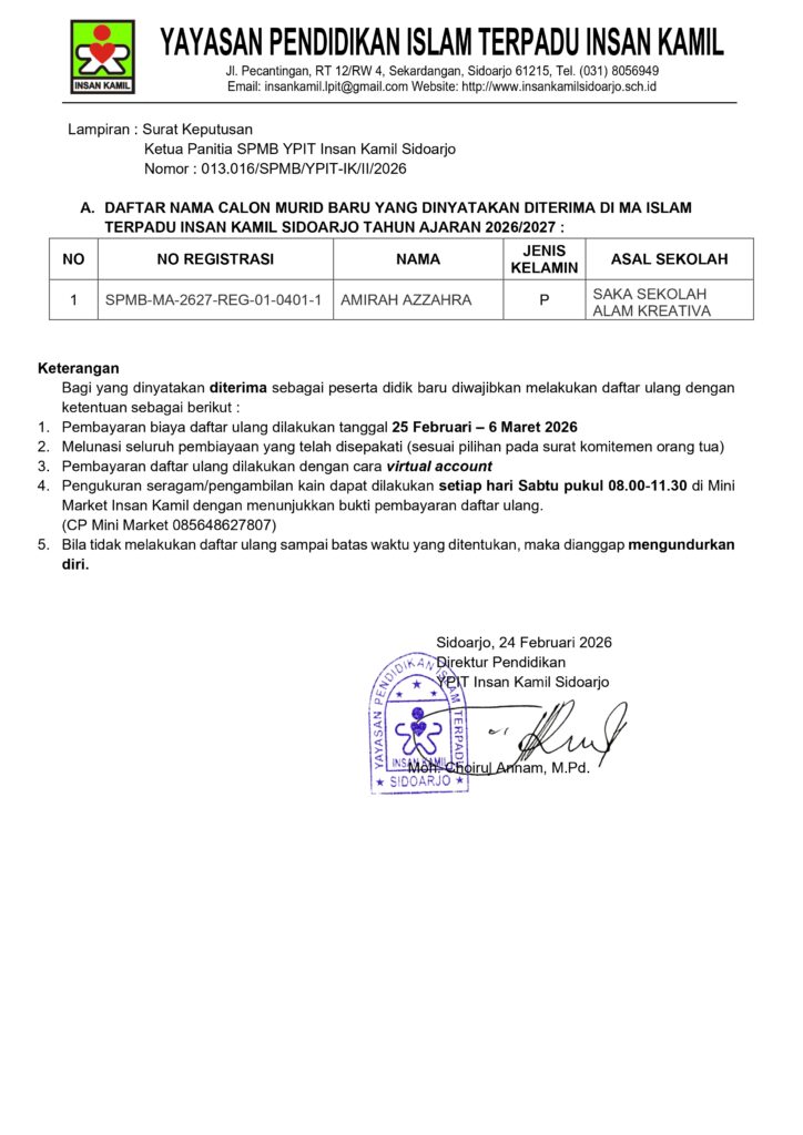 Pengumuman SPMB MAIT Insan Kamil Sidoarjo
