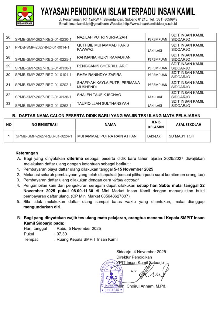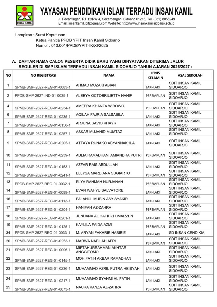 Pengumuman SPMB SMPIT Insan Kamil Sidoarjo