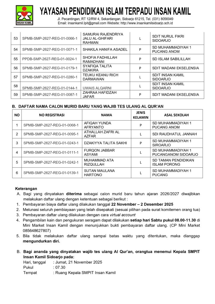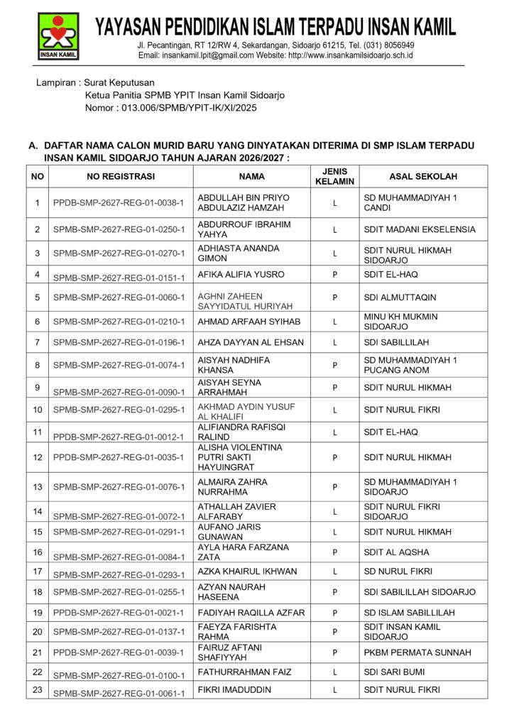 Pengumuman SPMB SMPIT Insan Kamil Sidoarjo