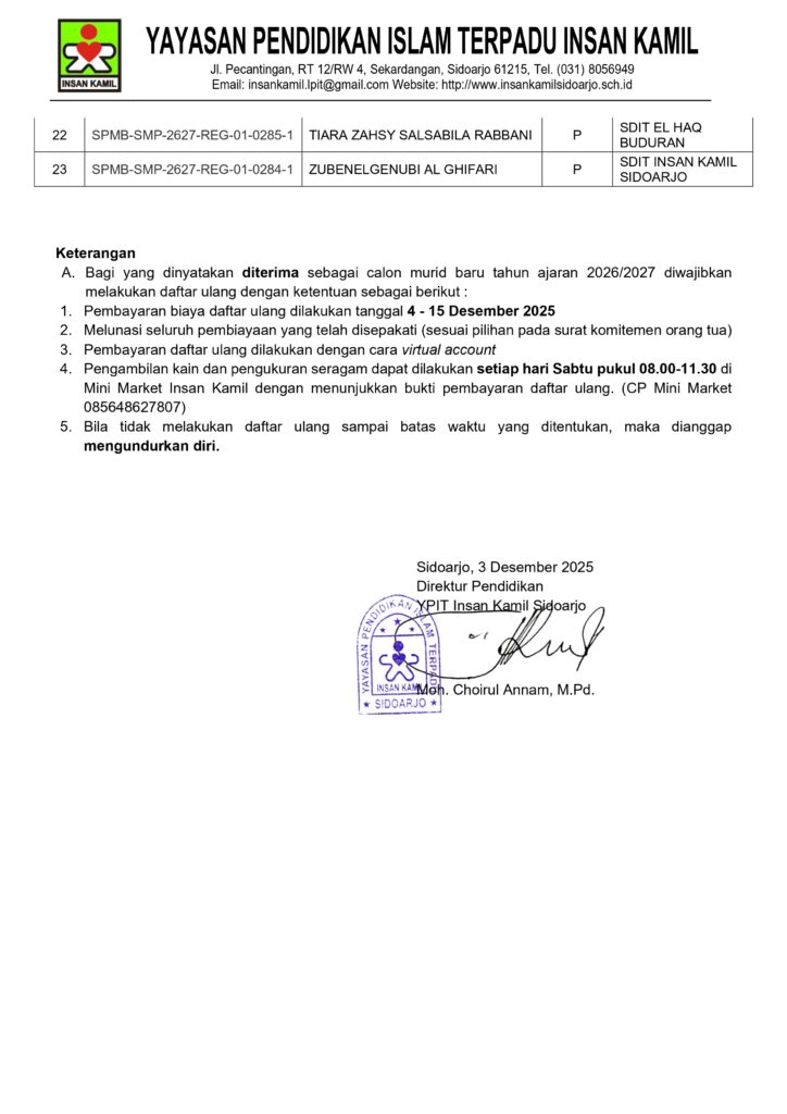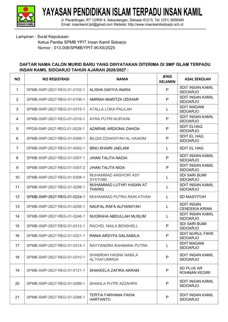 Pengumuman SPMB SMPIT Insan Kamil Sidoarjo