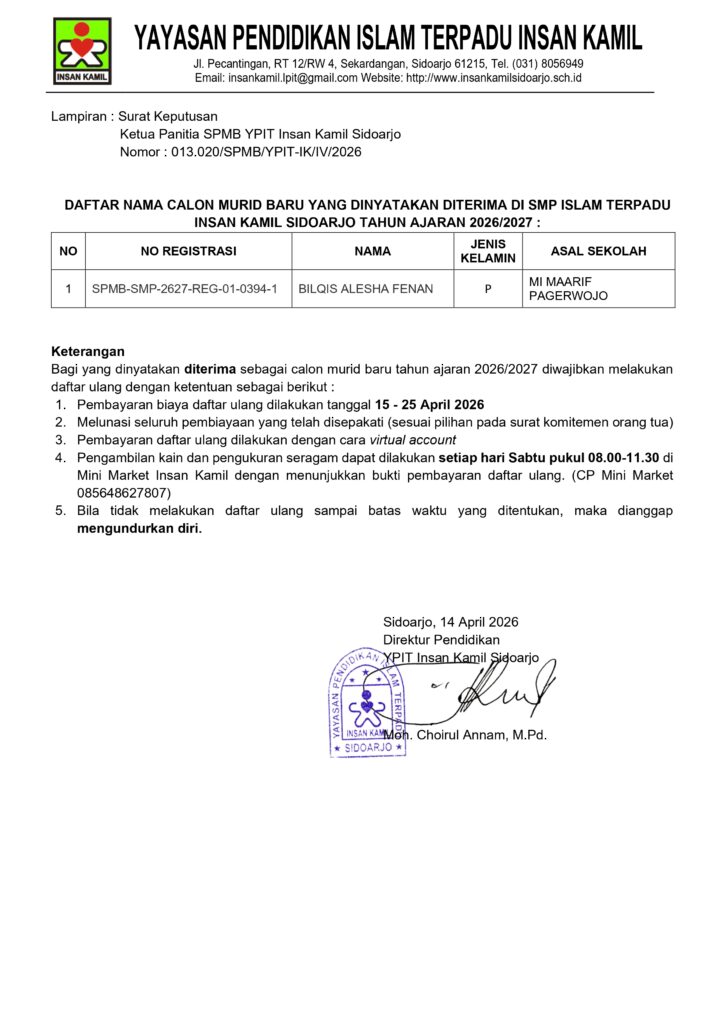 Pengumuman SPMB SMPIT Insan Kamil Sidoarjo